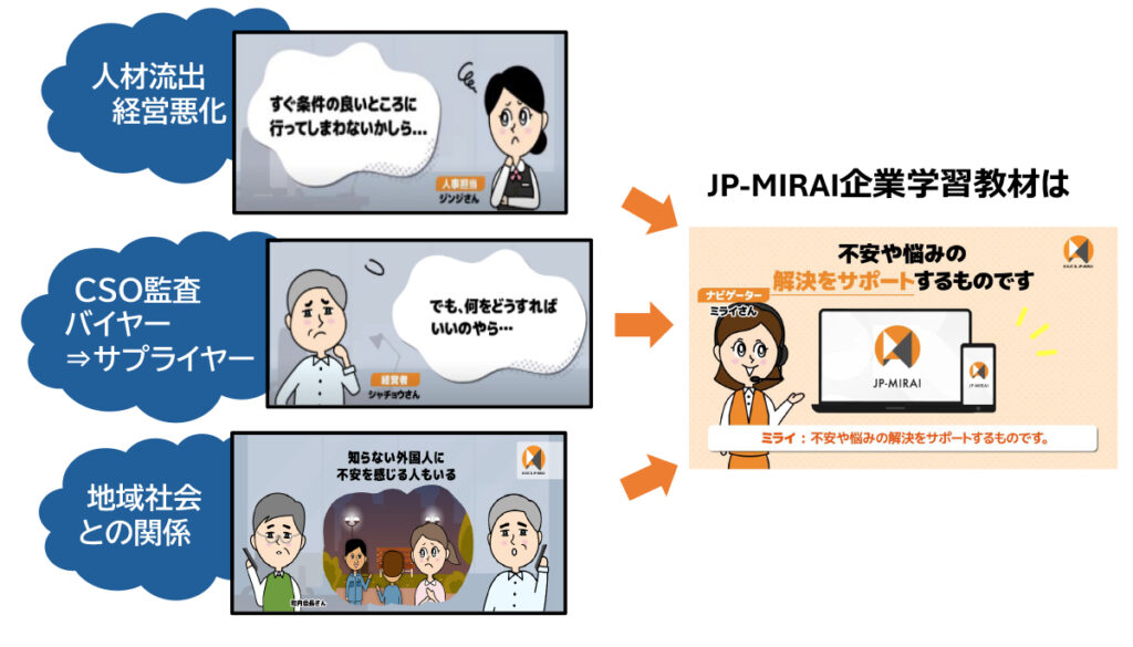 JP-MIRAIでは、外国人を雇用する企業が知っておくべき知識をわかりやすく解説し、予防・解決への行動へ繋げていたくための教材を作成・提供します。さらに、「使いたくなる」「使っていただける」教材を目指し、コンテンツのさらなる充実と普及を、企業のサプライチェーン、地方自治体、業界団体、商工会、社労士会等と連携しながら進めます。